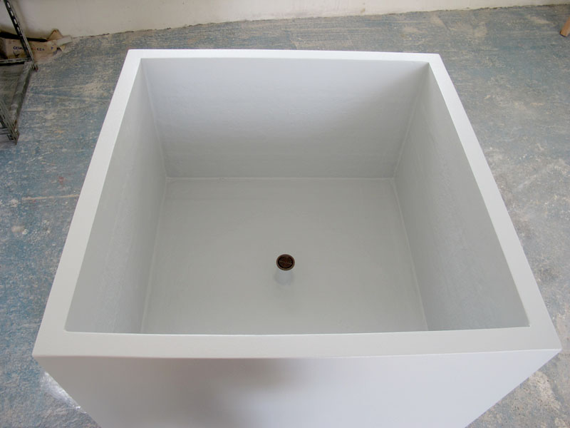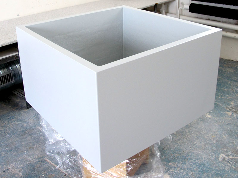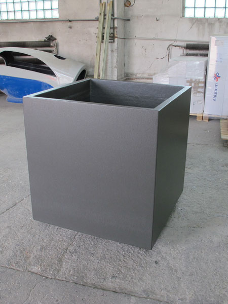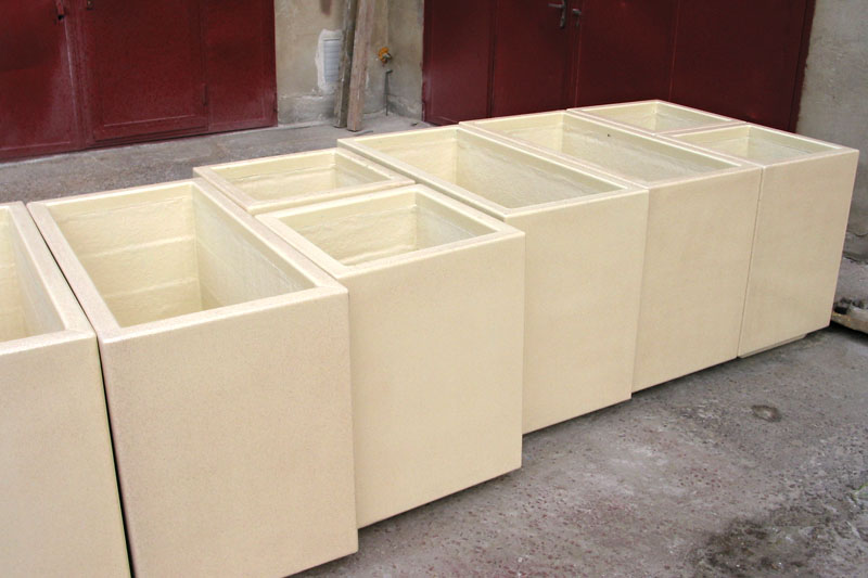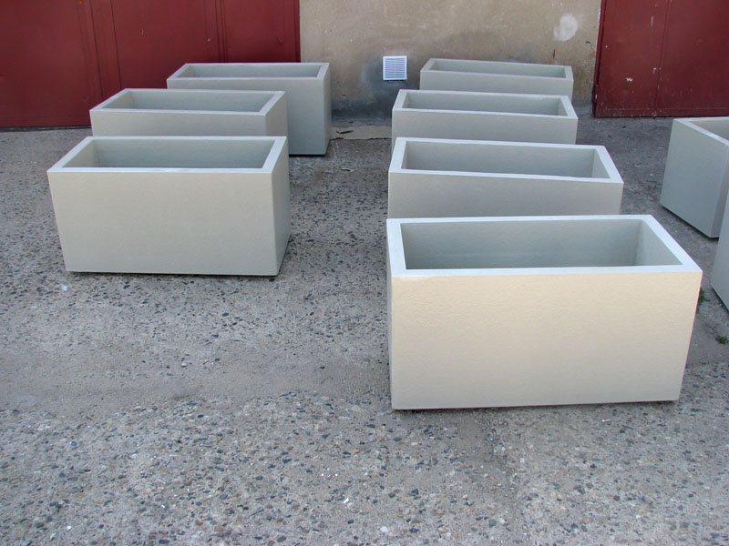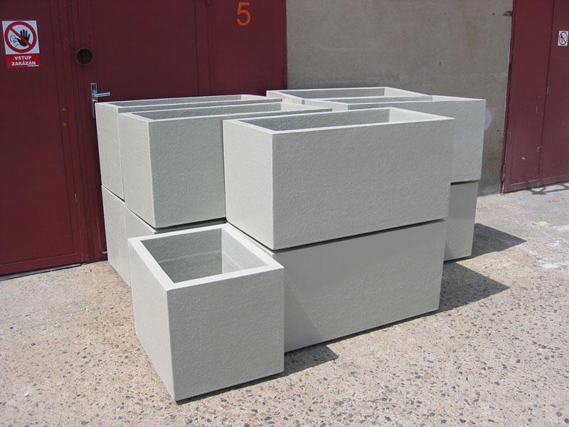 Výroba šesti květníků o rozměrech 1000x1000x600 mm. Provedení s jemně strukturovaným povrchem v barvě betonové šedi RAL 7035.