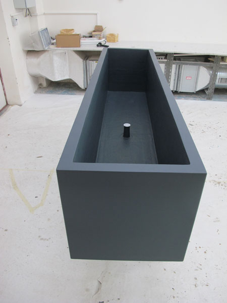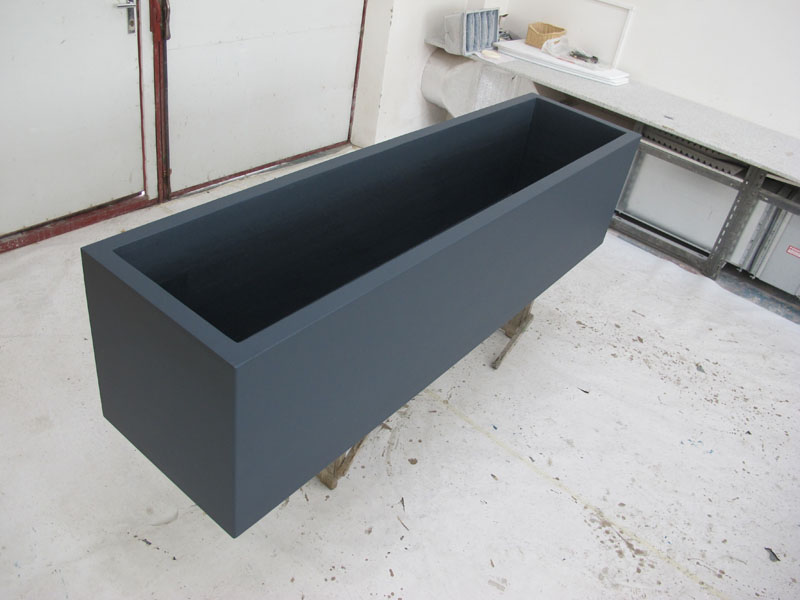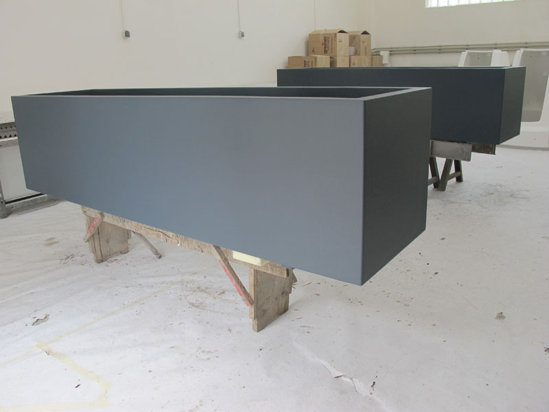 Výroba dvou květníků o rozměrech 2400x600x600 mm s antracitovým jemně strukturovaným povrchem. Instalováno v pobočce UCB České Budějovice.