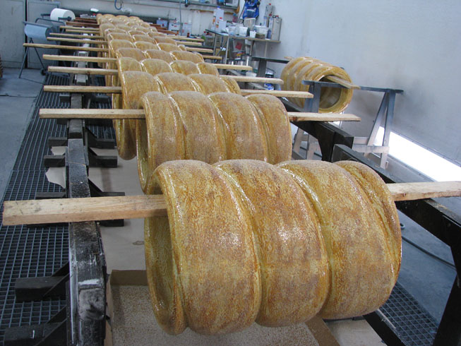 Výroba 15 ks zvětšených maket trdelníků. Rozměry: průměr 48 cm, délka 60 cm. Zákazník: Martin Švarc, Staročeské dobroty s.r.o.