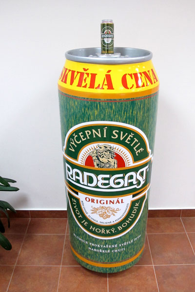 Výroba 50 ks maket pivních plechovek o výšce 130 cm. Makety jsou určeny jako reklamní poutač do prodejních prostor a lze je také použít jako bójky na vodě. Jejich součástí je demontovatelné závaží umístěné ve dně. Zákazník: Plzeňský Prazdroj, a.s.