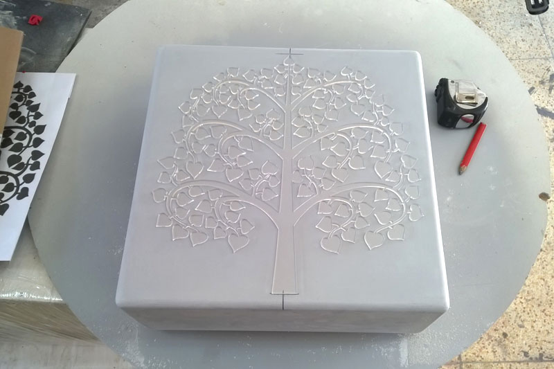 Výroba stínidel s motivem stromu štěstí a plastickým písmem, včetně pozlacené varianty.